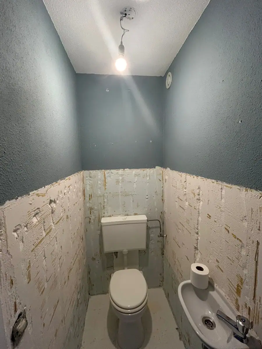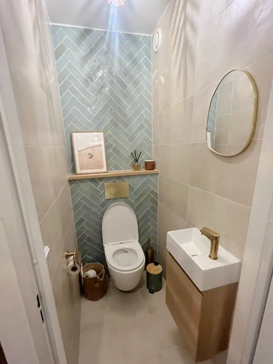 Deze complete toiletrenovatie transformeert een kleine ruimte tot een stijlvolle gastenbadkamer met maximale impact. Het opvallende groene visgraatpatroon op de achterwand contrasteert prachtig met de neutrale beige zijwanden. Deze slimme materiaalkeuze creëert visuele diepte en maakt de compacte ruimte groter dan deze is.